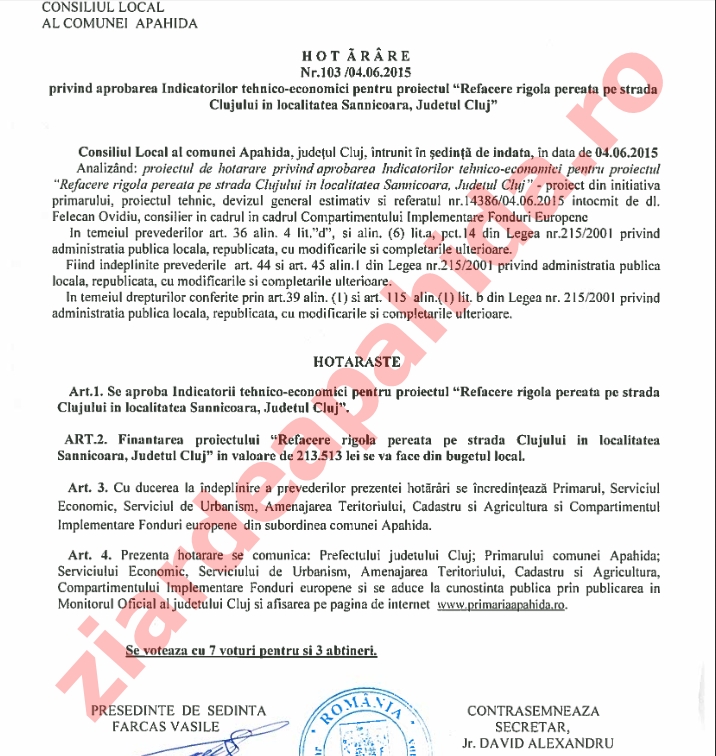 În ciuda acestor evidențe clare, secretarul Consiliului Local Alexandru David și-a pus semnătura de legalitate pe această hotărâre ilegală, care a mai fost semnată și de consilierul local Vasile Fărcaș, în calitate de președinte de ședință.