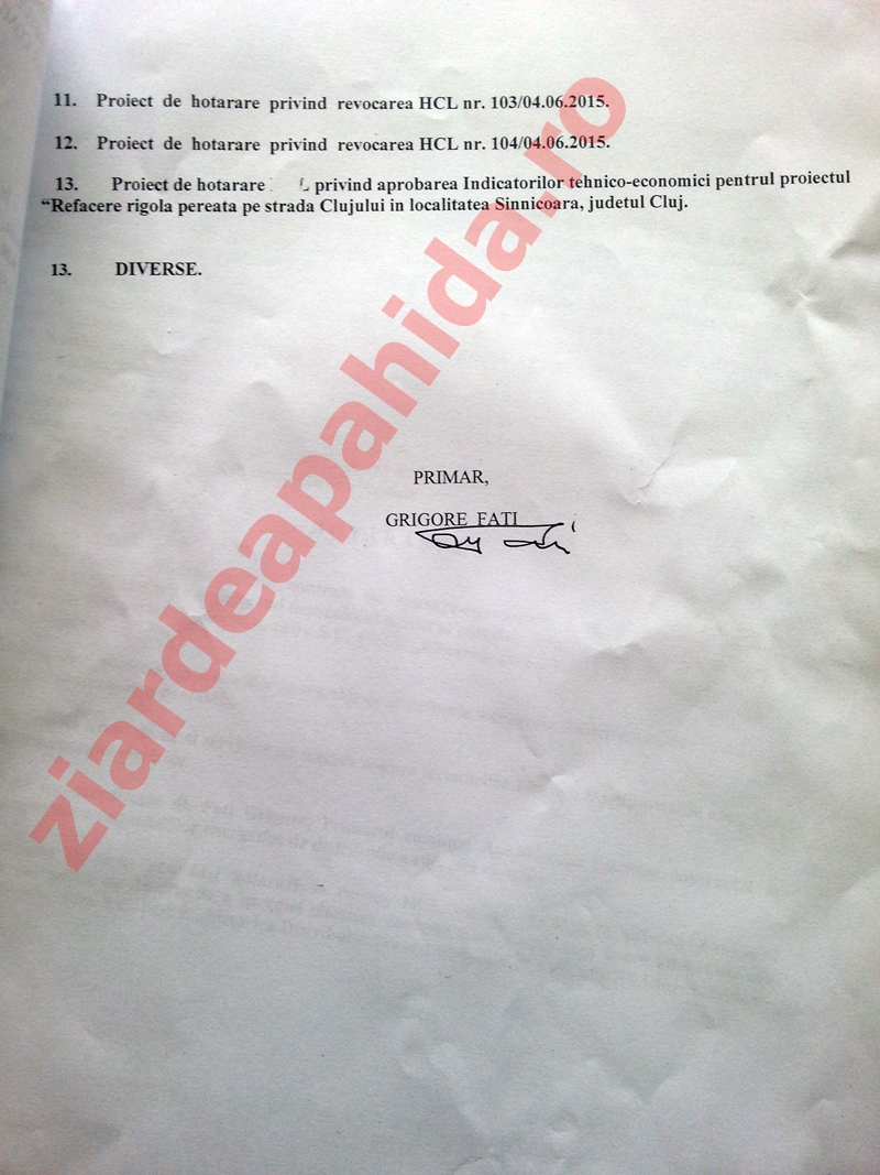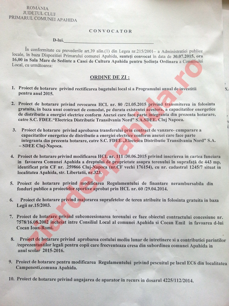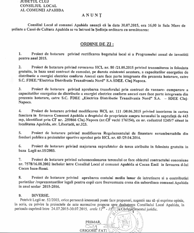 Pentru ședința de Consiliul Local Apahida din data de 30 iulie 2015, ora 16, pe site-ul Primăriei Apahida a fost afișată o ordine de zi care conține doar 10 proiecte de hotărâre, deși în mapele consilierilor locali, există o altă ordine de zi, care conține 13 proiecte de hotărâre.