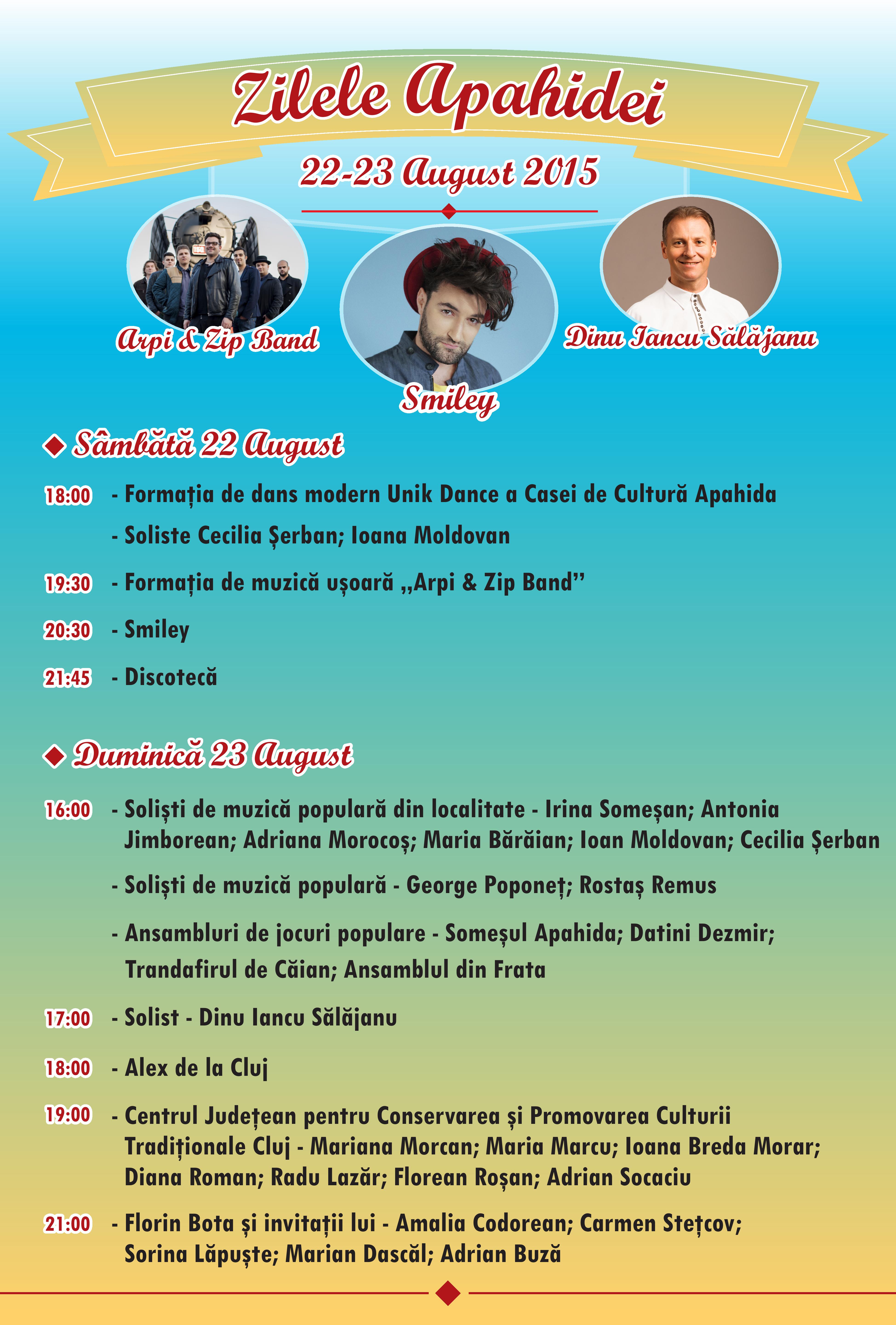 Vedeta incontestabilă care va cânta la această manifestare este Smiley. Celebru de la ”Românii au talent” dar și pentru piesele sale care au ajuns în topurile muzicale, Smiley va intra pe scenă, sâmbătă 22 august, de la ora 20.30. Din informații pe surse, Smiley va cânta o oră și va intra la biss cu o singură piesă, prestația fiind plătită cu suma de 8.500 de euro, cu mult mai mult decât suma de 7.200 de euro, vehiculată de Apahida.ro. Același Smiley a cântat cu ocazia unor alte festivaluri cu doar 5.000 de euro, dar acum, susțin sursele noastre, vedata va veni la Apahida alături de membrii trupei sale care, la rândul lor, vor încasa un onorar.