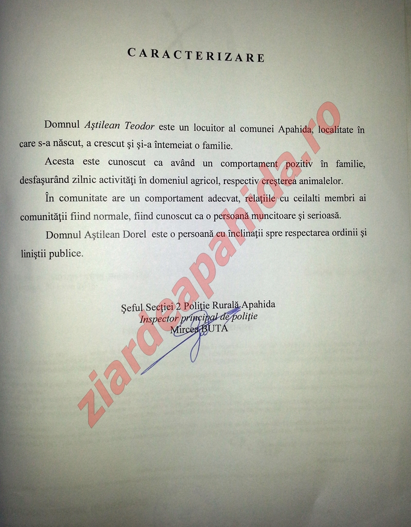 Vă reamintim că în timpul procesului în care Teodor Aștilean a fost judecat pentru uz de fals, la dosarul penal a fost depus un document, denumit ”caracterizare”, în care inspectorul Mircea Buta îl lăuda pe soțul directoarei economice de la Primăria Apahida, ca fiind un om bun și de comitet. ”Domnul Aștilean Teodor este un locuitor al comunei Apahida, localitate în care s-a născut, a crescut și și-a întemeiat o familie. Acesta este cunoscut ca având un comportament pozitiv în familie, desfășurând zilnic activități în domeniul agricol, respectiv creșterea animalelor. În comunitate are un comportament adecvat, relațiile cu ceilalți membri ai comunității fiind normale, fiind cunoscut ca o persoană muncitoare și serioasă. Domnul Aștilean Dorel este o persoană cu înclinații spre respectarea ordinii și liniștii publice”, a scris în caracterizare polițistul.