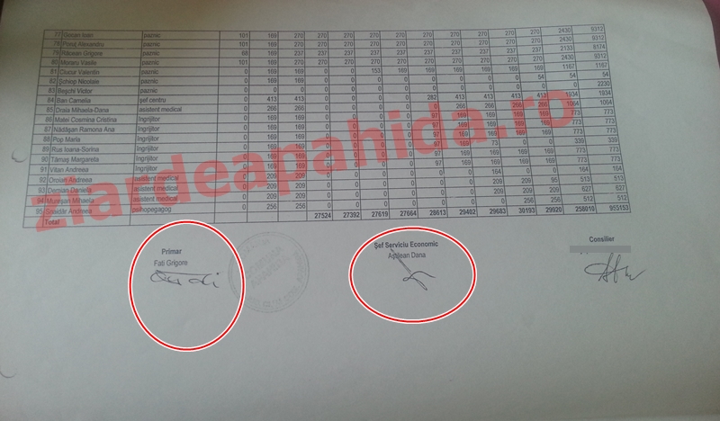 Tabelul cu primele ilegale cu angajații Primăriei care au primit sporul de fidelitate și cel de dispozitiv, împotriva prevederilor legale, a fost întocmit și semnat de primarul Grigore Fati și șeful Serviciului Economic, Dana Aștilean. Cei doi au predat inspectorilor Curții de Conturi, toată baza de date, pe ani și pe luni, cu fiecare angajat în parte.