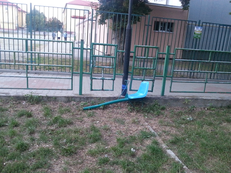 Un balansoar din fier stă rupt la gardul parcului. Bara de oțel este groasă cât o mână de om dar cu toate astea, vandalii au reușit să o rupă. ”Ce forță trebuie să ai ca să rupi o bară de zece. Mă gândesc câți tineri s-au urcat deodată pe acel balansoar de l-au rupt”. În altă parte, un tobogan este rupt de mai multe săptămâni în timp ce nimeni de la Primăria Apahida nu se grăbește să îl repare.