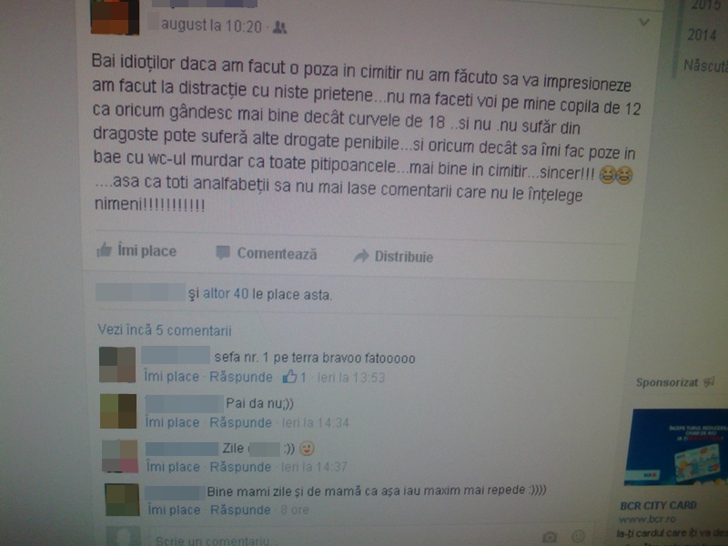 ”Băi idioților, dacă am făcut o poză în cimitir nu am făcut-o să vă impresioneze, am făcut la distracție cu niște prietene … nu mă faceți voi pe mine copilă de 12 ani, că oricum gândesc mai bine decât curvele de 18 … și nu, nu sufăr din dragoste, poate suferă alte drogate penibile … și oricum decât să îmi fac poze în baie, cu wc-ul murdar ca toate pițipoancele … mai bine în cimitir … sincer!!! … așa că toți analfabeții să nu mai lase comentarii care nu le înțelege nimeni!!!!!!”, a scris tânăra.