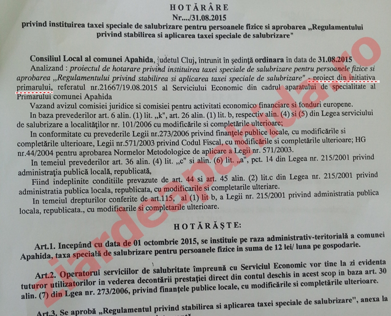 În referatul 21667/18.08.2015, aprobat de primarul colonel Grigore Fati, directorul economic al Primăriei Apahida, Dana Aștilean propune modificarea impozitelor și taxelor locale, ”pentru anul 2015, lunile octombrie, noiembrie și decembrie și pentru anul 2016 … prin instituirea unei taxe denumită, taxa salubritate, în sumă de 12 lei/lună pe gospodărie, cu termen de plată – 50 la sută până la 31 martie și alt procent de 50 la sută până la 30 septembrie. Pentru lunile rămase din anul 2015, termenul de plată este 31 decembrie 2015”.