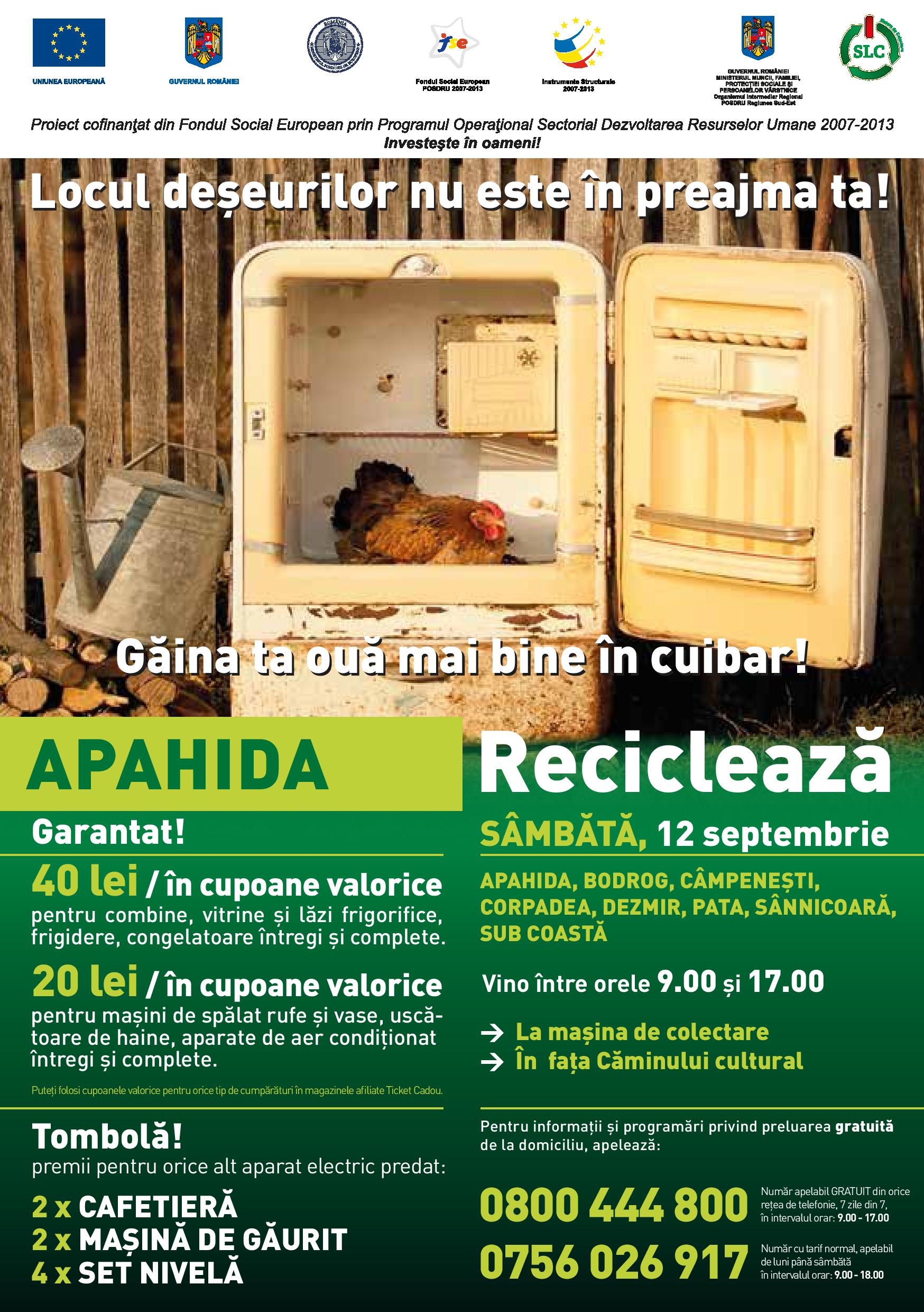 Acțiunea de colectare se referă la toți locuitorii comunei Apahida. Cei care vor aduce aparate electrice mari, întregi, cum ar fi vitrine, combine, lăzi frigorifice, congelatoare vor primi tichete cadou de 40 de lei.