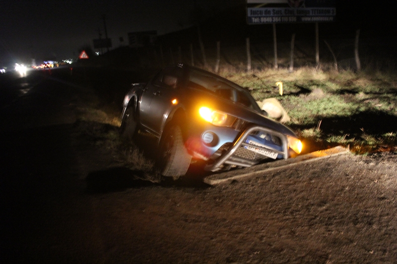 Un autoturism Mitsubishi L200 a derapat din cauza carosabilului acoperit cu mâzgă şi s-a oprit într-un cap de pod de pe cealaltă parte a drumului.