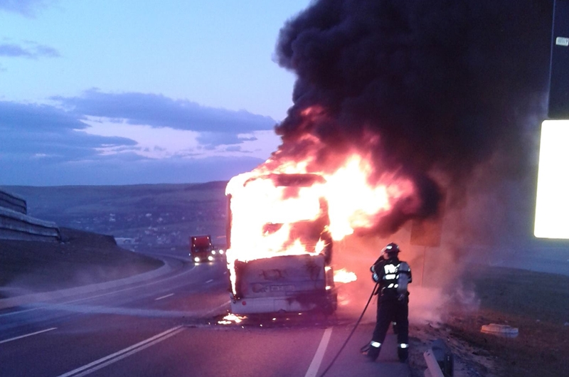 Un autocar a ars complet din cauza unui incendiu care s-a produs la partea electrică. Incidentul s-a petrecut pe centura Vâlcele – Apahida