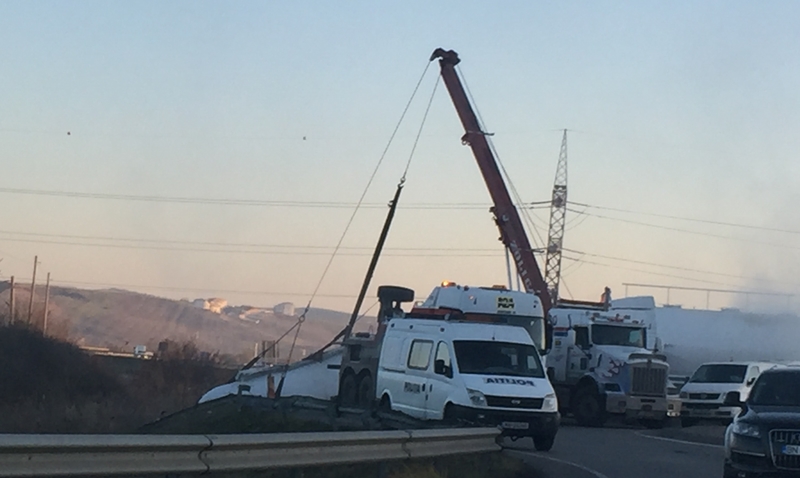 Un autotren care transporta ciment la un pas de prăpăd la Câmpenești. A ajuns pe câmp și s-a răsturnat