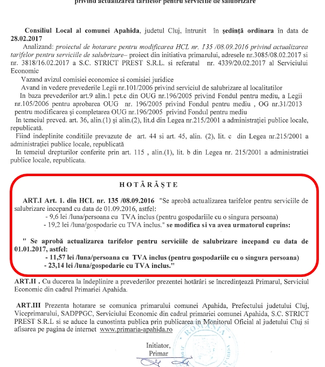 Ziar de Apahida a avut dreptate! Prețul taxei de salubritate a crescut de la 15.8 lei la 23.14 de lei!