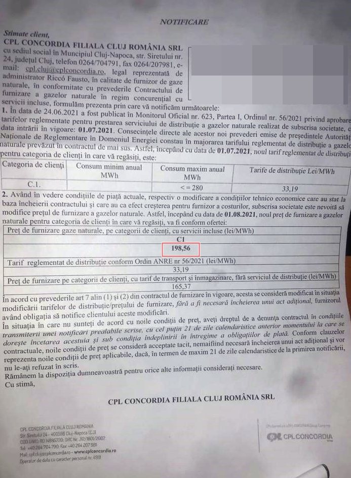 Cei de la Concordia CPL au scris în notificare că prețul nou este de 198.56 lei pentru un MWh, pentru ca oamenii să nu își dea seama cât anume va fi creșterea.