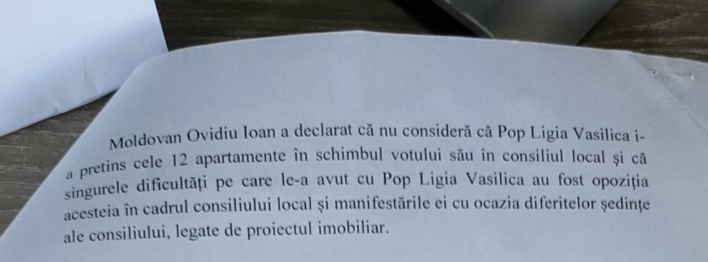 Moldovan Ovidiu Ioan a declarat că nu consideră că Pop Ligia Vasilica i-a pretins cele 12 apartamente în schimbul votului său în Consiliul Local. Și că singurele dificultăți pe care le-a avut cu Pop Ligia Vasilica au fost opoziția acesteia în cadrul Consiliului Local și manifestărle ei cu ocazia diferitelor ședinte ale Consiliului, legate de proiectul imobiliar.