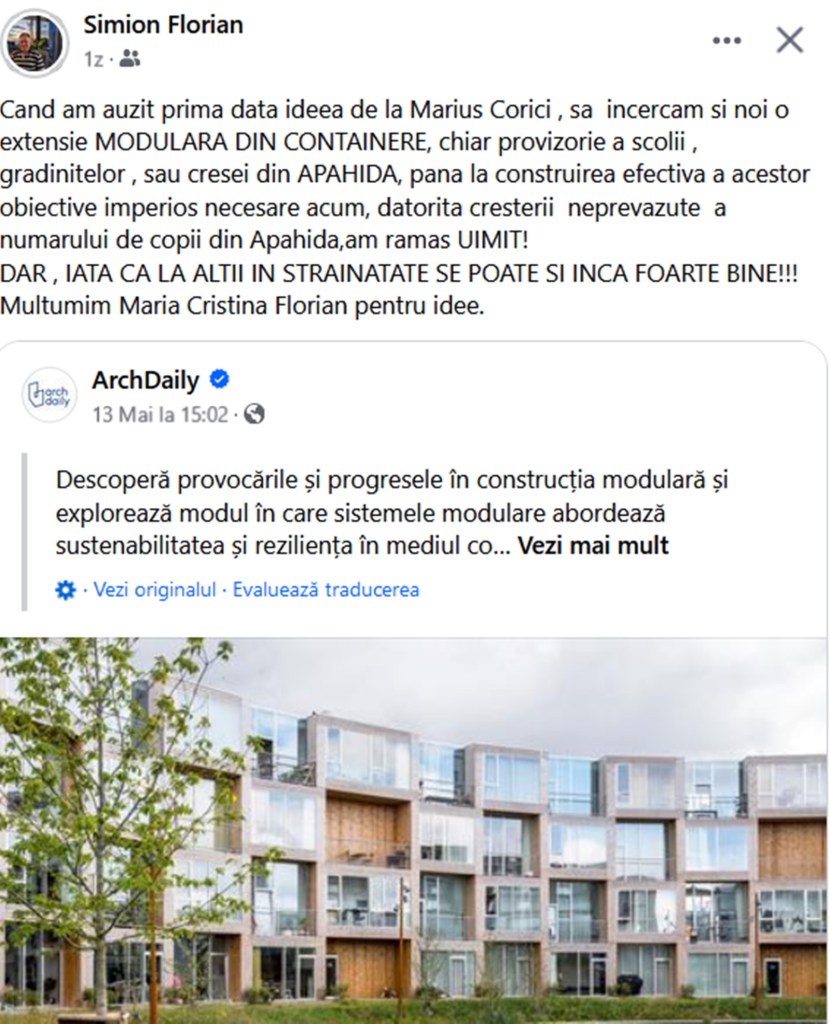 ”Când am auzit prima dată ideea de la ***, să încercăm și noi o extensie modulară din containere, chiar provizorie a școlii, gradinițelor, sau creșei din Apahida, până la construirea efectivă a acestor obiective imperios necesare acum, datorită creșterii neprevăzute a numărului de copii din Apahida, am rămas uimit! Dar iată că la alții în străinătate se poate și încă foarte bine. Mulțumim Maria Cristina Florian pentru idee”, a scris consilierul local PNL Apahida, Simion Florian.