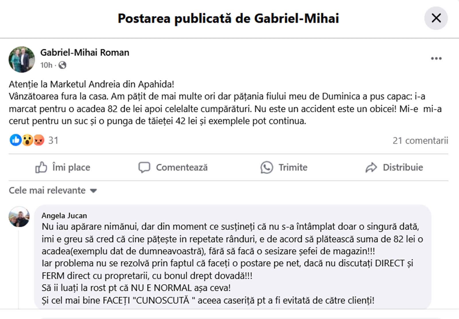 ”Nu iau apărare nimănui, dar din moment ce susțineți că nu s-a întâmplat doar o singură dată, îmi e greu să cred că cine pățește in repetate rânduri, e de acord să plătească suma de 82 lei o acadea (exemplu dat de dumneavoastră), fără să facă o sesizare șefei de magazin!!! Iar problema nu se rezolvă prin faptul că faceți o postare pe net, dacă nu discutați direct și ferm direct cu propretarii, cu bonul drept dovadă!!! Să îi luați la rost pentru că nu e normal așa ceva! Și cel mai bine faceți “cunoscută” aceea caseriță pentru a fi evitată de către clienți!”, a scris Angela Jucan.