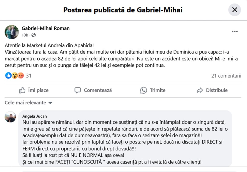”Atenție la Marketul A*** din Apahida! Vânzătoarea fură la casă. Am pățit de mai multe ori dar pățania fiului meu de Duminica a pus capac: i-a marcat pentru o acadea 82 de lei, apoi celelalte cumpărături. Nu este un accident este un obicei! Mi-e mi-a cerut pentru un suc și o punga de tăieței 42 lei și exemplele pot continua”, a scris Gabriel Mihai Roman, pe grupul ”cetățeni din Apahida”.
