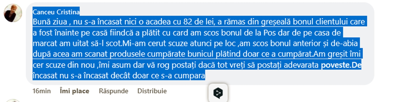 ”Bună ziua. Nu s-a încasat nici o acadea cu 82 de lei. A rămas din greșeală bonul clientului care a fost înainte pe casă fiindcă a plătit cu card am scos bonul de la Pos, dar de pe casa de marcat am uitat să-l scot. Mi-am cerut scuze atunci pe loc, am scos bonul anterior și de-abia după acea am scanat produsele cumpărate, bunicul plătind doar ce a cumpărat. Am greșit îmi cer scuze din nou, îmi asum dar vă rog postați dacă tot vreți să postați adevarata poveste. De încasat nu s-a încasat decât doar ce s-a cumpărat”, a scris Cristina Canceu.